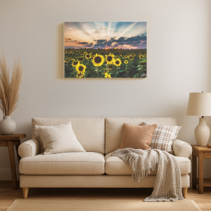 A vibrant field of sunflowers at sunset with sun rays piercing through clouds