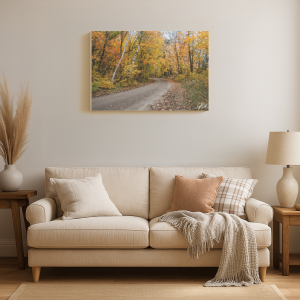 Curved dirt road surrounded by vibrant autumn trees with orange, yellow, and red leaves.