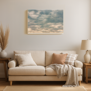 A vast sky filled with swirling, textured clouds in shades of blue and cream