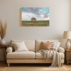 An old wooden farmhouse stands alone in a vast green field beneath a picturesque sky with colorful, swirling clouds.