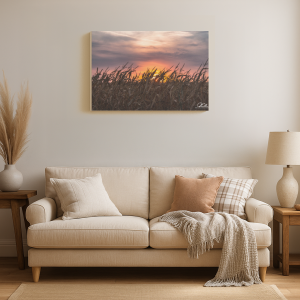 Sunset over a cornfield with silhouetted plants and dramatic sky.