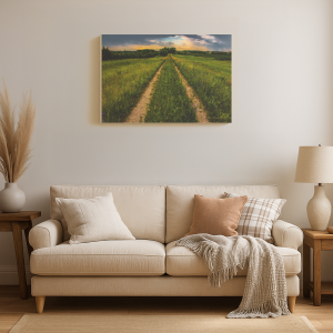A narrow, grassy path stretching into lush green fields under a dramatic sky.