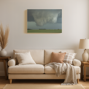 A large, ominous cloud formation resembling a funnel cloud hangs over a flat, green field under a dark sky.