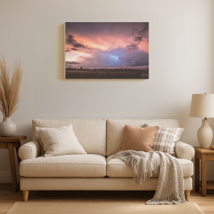 A vast sky at sunset painted with vibrant hues of pink, orange, and blue above a darkened silhouette of a horizon line with distant trees.
