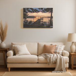 Wooden dock leading to a calm lake during a vibrant sunset with trees framing the scene.