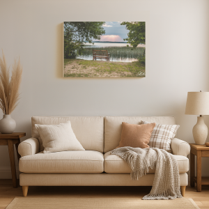A wooden bench facing a serene lake, framed by trees and reeds, with sunlight breaking through the clouds in the distance.