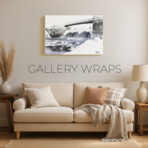 A snow-covered dam with cascading water under a metal footbridge in a winter landscape