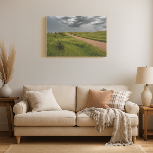 Dirt road winding through lush green rolling hills under a dramatic stormy sky with swirling dark clouds.