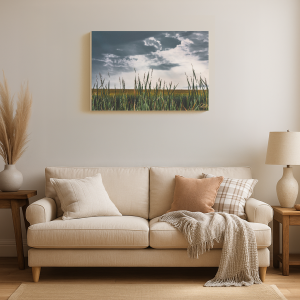 Tall grass under a dramatic, cloudy sky with dark and light contrast.