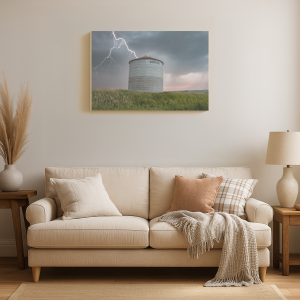 Lightning strikes near a solitary grain silo in a vast green field under a stormy sky.