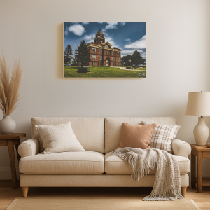 Historic red-brick courthouse with clock tower under a partly cloudy sky, surrounded by green lawn and trees