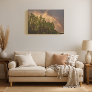 A vivid rainbow arcs above a dense cluster of green trees under a dramatic sky.