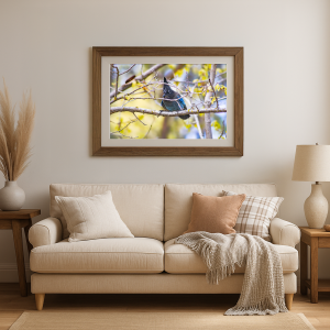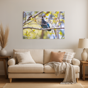 Amidst the golden whispers of leaves, a blue bird perches pensively on a branch. The textured landscape frames this avian figure, caught between vibrant yellow hues and the gentle decay of fall. Its feathers reflect the depth of the sky, contrasting the rustic tapestry that surrounds it. This image evokes a sense of introspective calm, a brief pause in the tempo of nature. Each leaf and branch detail contributes to a harmonious composition synonymous with the quietude of a woodland sonnet.