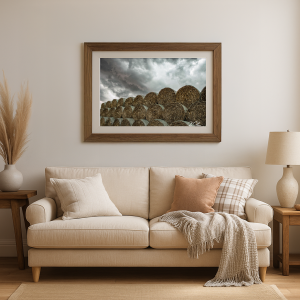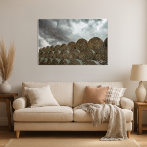 In this captivating scene, a row of neatly stacked hay bales looms beneath a turbulent sky, balancing the calm solidity of the earth with the unrestrained chaos above. The clouds swirl menacingly, painted in shades of gray that foretell a storm’s imminent arrival. Light struggles to pierce through, casting a gentle glow on the textured surfaces of the bales, creating a juxtaposition of warmth and foreboding. This image captures the relentless dialogue between human endeavor and nature’s untamed spirit, inviting viewers to pause and reflect on the unpredictable dance of weather and agriculture.