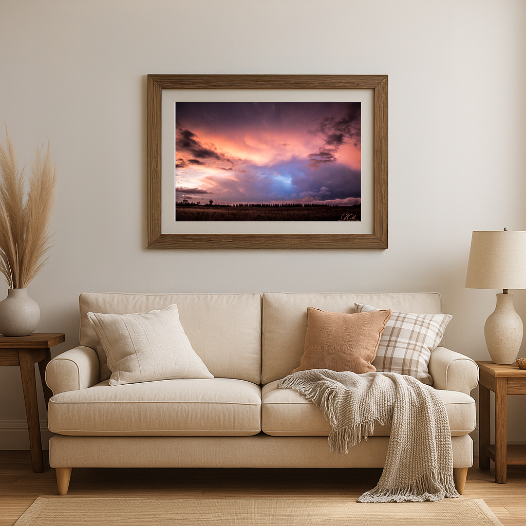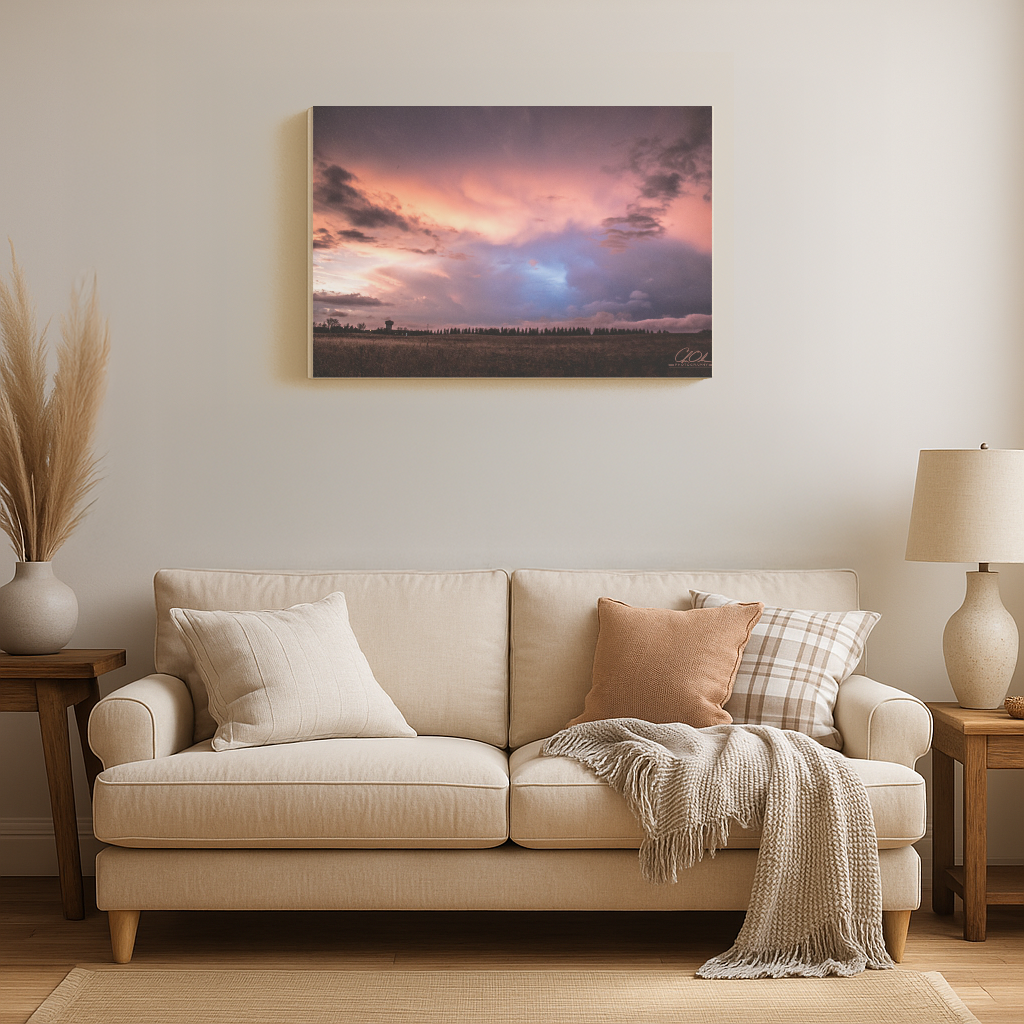 An ethereal display of colors marks the transition from day to night. The sky, alive with a palette of coral and azure, seems to breathe with each passing cloud. Beneath this spectacle, the distant silhouette of trees stands in quiet reverence. The atmosphere is charged with a profound sense of awe and melancholy, a potent reminder of the transient beauty in natures daily cycles. The fading light casts an emotional resonance, enveloping the viewer in a moment of contemplative wonder.