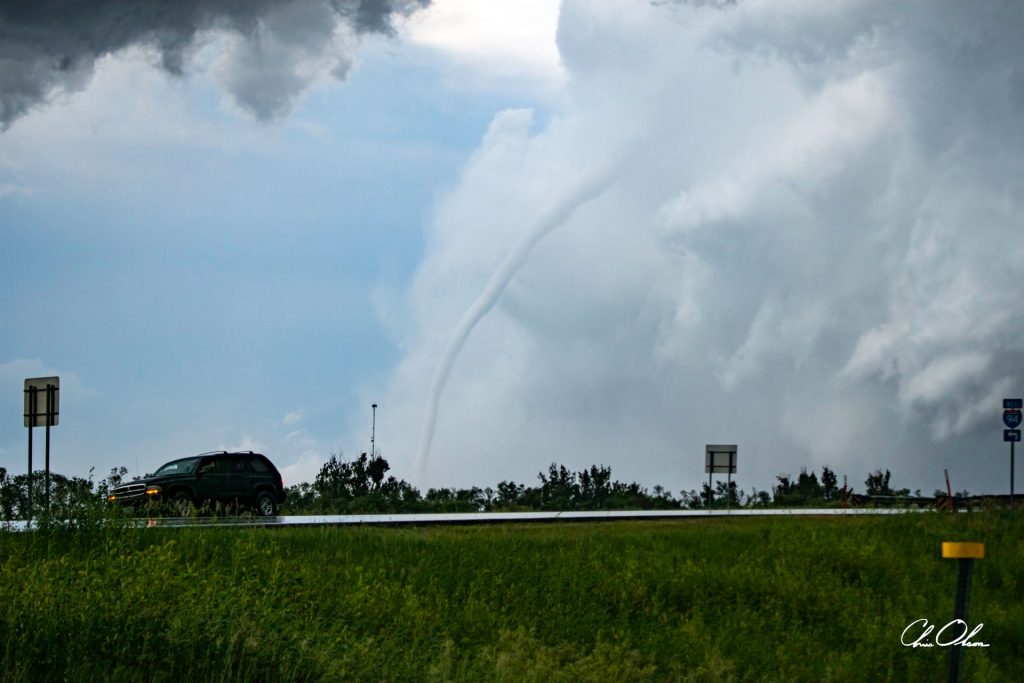 A rare anticyclonic tornadospinning clockwise instead of the usual counterclockwisetouches down just off Interstate 94 near Jamestown, North Dakota, on June 20th, 2025. Slender yet powerful, this rope tornado twists gracefully from a storm with intense directional shear. Its rarity, symmetry, and proximity to passing traffic make this a striking portrait of nature defying the norm.