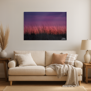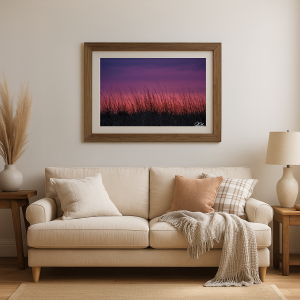 As the sun dips beyond the horizon, the sky transforms into a canvas of rich purples and fiery reds. The tall grass stands as a silhouetted witness to nature’s daily masterpiece, each blade etched against the vibrant backdrop. This image evokes a sense of calm and reflection, inviting the viewer to pause and appreciate the fleeting artistry of dusk. The serenity of the scene whispers of quiet moments and endless possibilities. A perfect piece for those who seek beauty in the simplicity of nature.