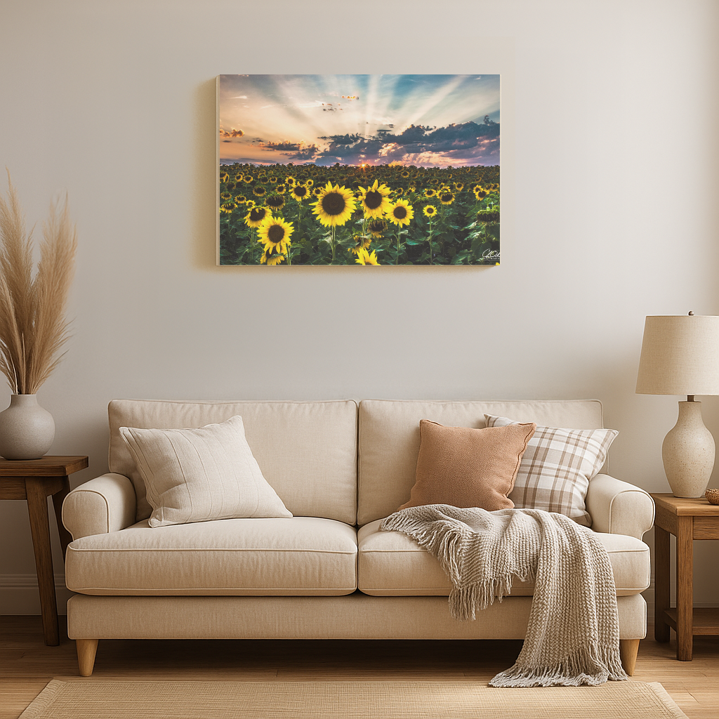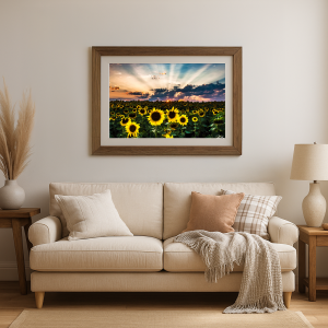 As the sun dips below the horizon, a sea of sunflowers turns its golden faces to the fading light, each petal catching the last tender rays Above, clouds ripple across a twilight sky, creating a tapestry of color and shadow The moment whispers of renewal and hope, natures quiet reminder to embrace the glow of each passing day