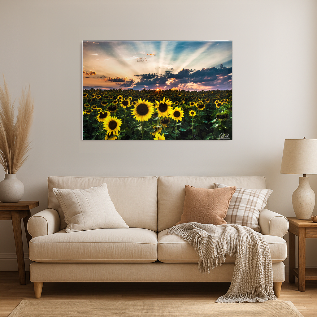 Sunflowers stretch toward the horizon, basking in the warmth of a golden sunset as clouds scatter light across the sky
