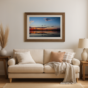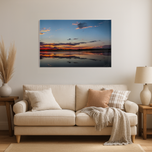 As the day wanes, the sky ignites with hues of orange and crimson, casting a warm embrace upon the serene waters The clouds dance in fiery splendor, mirrored by the lakes glassy surface, creating a mesmerizing tapestry of light and shadow This scene captures a fleeting, yet eternal moment where the earth seems to hold its breath, wrapped in the tranquil glow of a perfect dusk