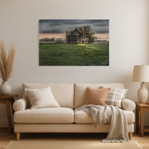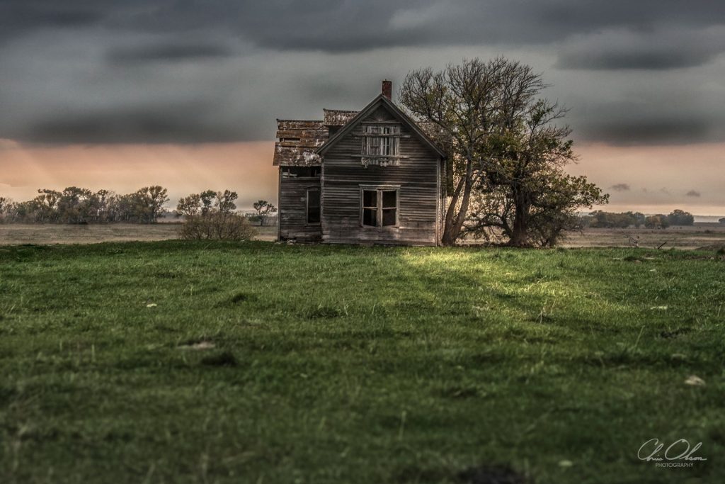 A solitary wooden house stands amid rolling fields, silhouetted against a moody sky.