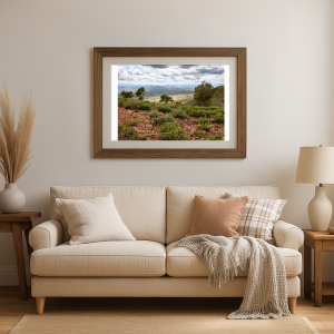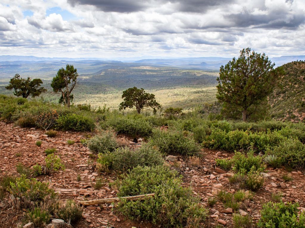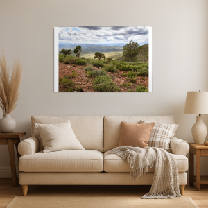 A tapestry of textured earth and resilient flora unfolds under a dramatic canopy of clouds, the distant hills echoing tales of time unmeasured. Each tree stands as a sentinel, grounded yet reaching, while the horizon blurs into infinity. The play of light and shadow over the undulating terrain creates a palpable sense of openness and solitude. The clouds above, a soft symphony of grays and whites, weave a mood of contemplation across the scene. In this vastness, the land breathes an untold story of endurance and quiet dignity.