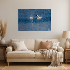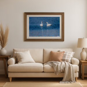 In this captivating scene, two swans find harmony as they float across a vast canvas of sapphire water. The light dances tenderly, casting delicate reflections that ripple gently around them. The pair exude a serene companionship, invoking a timeless sense of tranquility. This artwork invites you to pause and lose yourself in the gentle embrace of nature’s elegance, where simplicity meets profound beauty.
