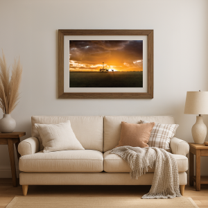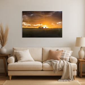 In this enchanting scene, the horizon blazes with the intense glow of a setting sun, casting a golden hue over the land Silhouetted gracefully against this backdrop, two deer appear to dance across the field, embodying a fleeting moment of wild freedom The sky, a dramatic interplay of luminous oranges and shadowy grays, creates a striking contrast that magnifies the beauty of this moment Power lines stretch across the scene, grounding the ethereal spectacle and reminding us of the delicate balance between nature and human presence The image captures the spirit of adventure and serenity, as day gracefully bows to night