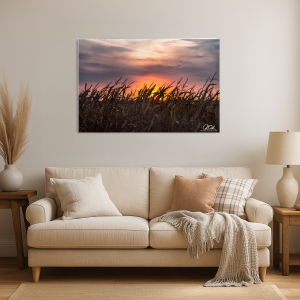 The horizon blazes with the fervor of a dying day, as an autumn sun kisses the earth goodbye. Tall corn stalks stand silhouetted against the vibrant sky, a silent congregation in nature’s chapel. Each rustling leaf catches the warm light, turning the field into a sea of liquid gold. Above, clouds dance in fiery hues of orange and violet, capturing the breath of a world cloaked in serenity. This scene immortalizes a fleeting moment of perfect harmony between land and sky.