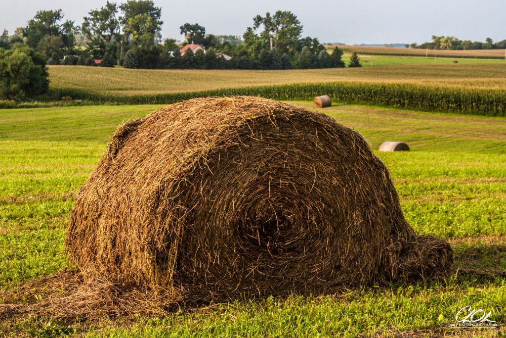 The landscape stretches out, painted with the earthy tones of late summer A straw bale lies in quiet dignity, embodying the essence of harvest time The rolling hills beyond are dotted with a patchwork of cornfields and trees swaying gently in the breeze Theres an inviting warmth as the sunlight casts long shadows, evoking a sense of nostalgia and the simplicity of country living This serene scene invites the viewer to pause, breathe, and let the gentle whispers of nature cradle their thoughts