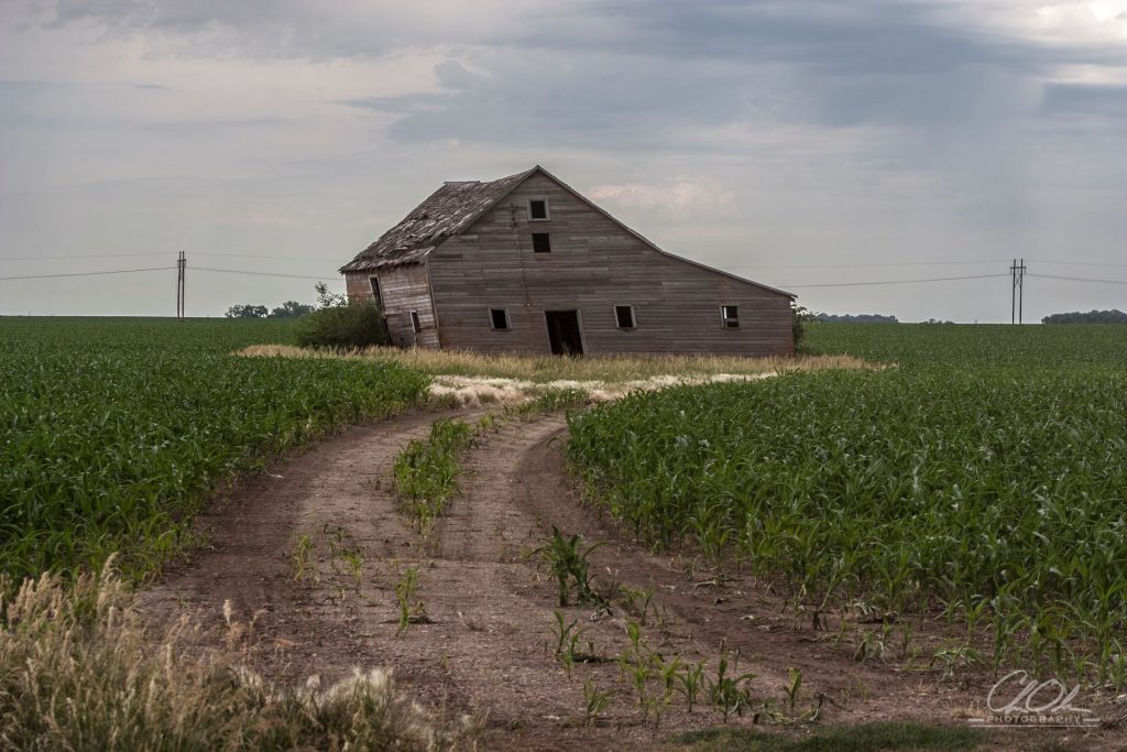A solitary barn stands as a testament to the past, leaning gently in an expansive green field under an overcast sky.