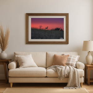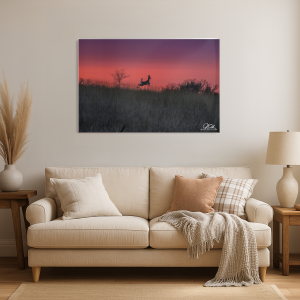 As the sun dips below the horizon, the sky bursts into a tapestry of fiery hues, casting a dramatic backdrop against a field of silhouetted grasses. A deer, caught in a moment of pure grace, leaps effortlessly, its form a dark silhouette against the vivid canvas of purple and red. This scene captures a fleeting moment of untamed elegance, evoking a sense of freedom and the undisturbed beauty of nature’s twilight dance.