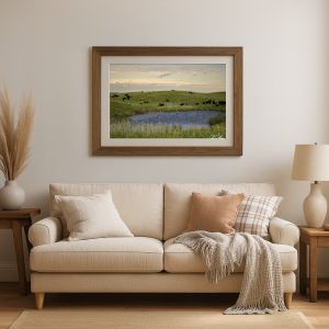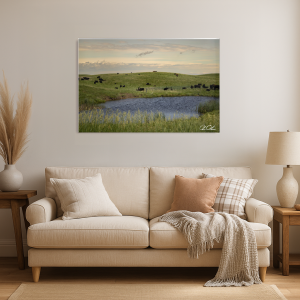 In the heart of rolling hills, a gentle pond reflects the muted hues of a shifting sky. Cattle, like sentinels of the land, dot the emerald expanse, their presence a quiet testament to the timeless rhythm of rural life. The scene speaks of peace and permanence, evoking an era untouched by haste. As you gaze, the whispering breeze seems to carry stories of the earth’s enduring patience, where nature and time move in harmonious cadence.