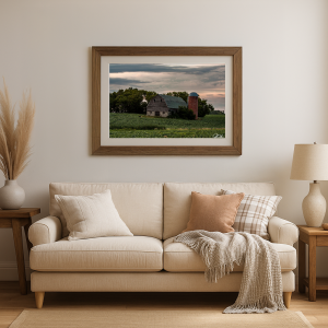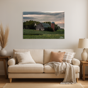 Beneath a moody, cloud-laden sky, an aged barn and its steadfast silo keep watch over expansive green fields. The gentle hues of dusk paint the scene with a touch of nostalgia. Trees frame the structure, adding depth to a tableau that whispers of heritage and the passage of time. An air of serenity envelops the landscape, evoking memories of simpler days and whispered stories of the land’s past.