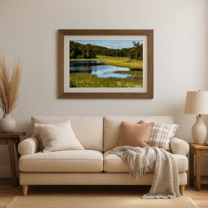 A serene pond reflects the lush embrace of trees under an azure sky, capturing a moment of pure stillness.