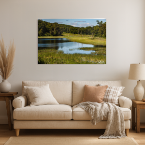 In this peaceful scene, a gentle pond mirrors the surrounding trees, their leaves whispering secrets of the forest. The sky above is a vast blue canvas dotted with clouds, lending an air of infinite calm. The waters surface is so still, it seems to hold time within its depths. The soft light dances across the landscape, painting a portrait of untouched beauty. This tranquil setting invites the viewer to pause, breathe, and become one with nature.