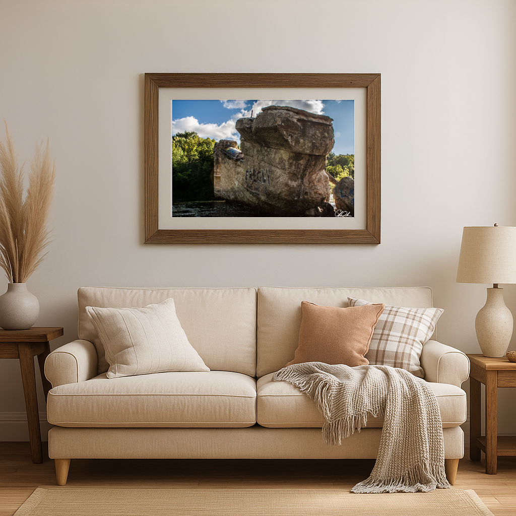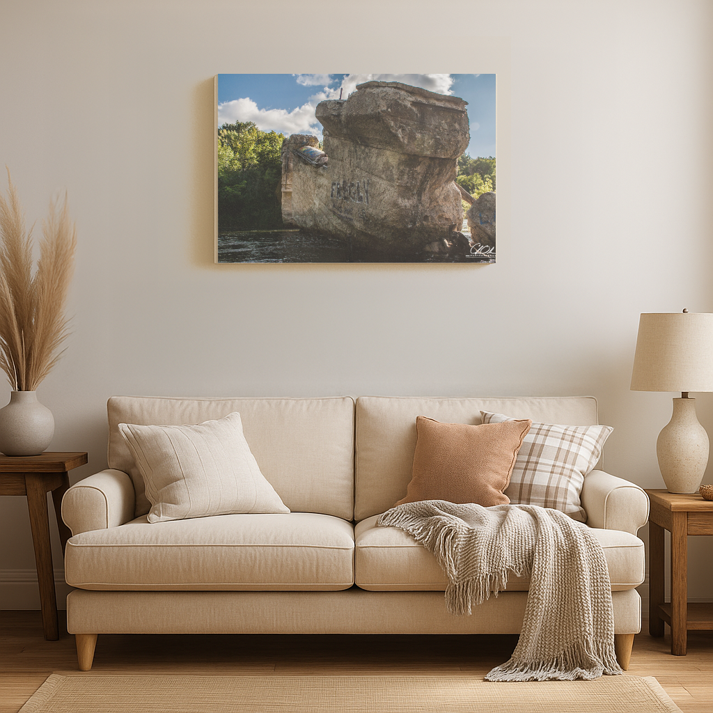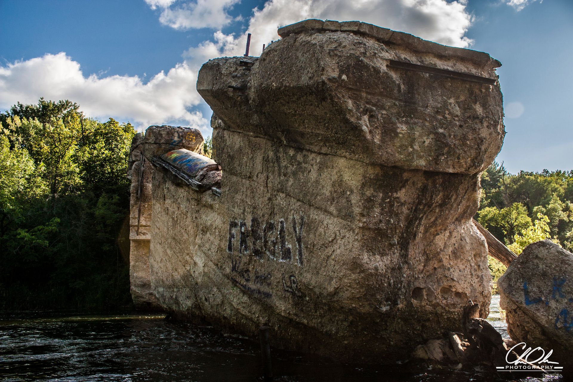 This evocative photograph captures a massive, timeworn stone structure, looming like a forgotten sentinel amidst the gentle embrace of vibrant green foliage. The graffiti etched upon its surface adds a layer of human history to the rugged endurance of the stone. Slivers of sunlight dance across the scene, highlighting textures and creating a dialogue between the natural and the manmade. The contrast between the decaying human artifact and the thriving natural surroundings whispers stories of endurance, decay, and renewal, inviting the viewer to reflect on the passage of time and the impermanence of human endeavors.