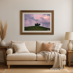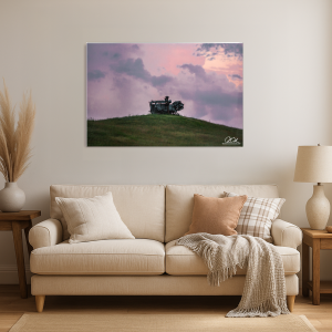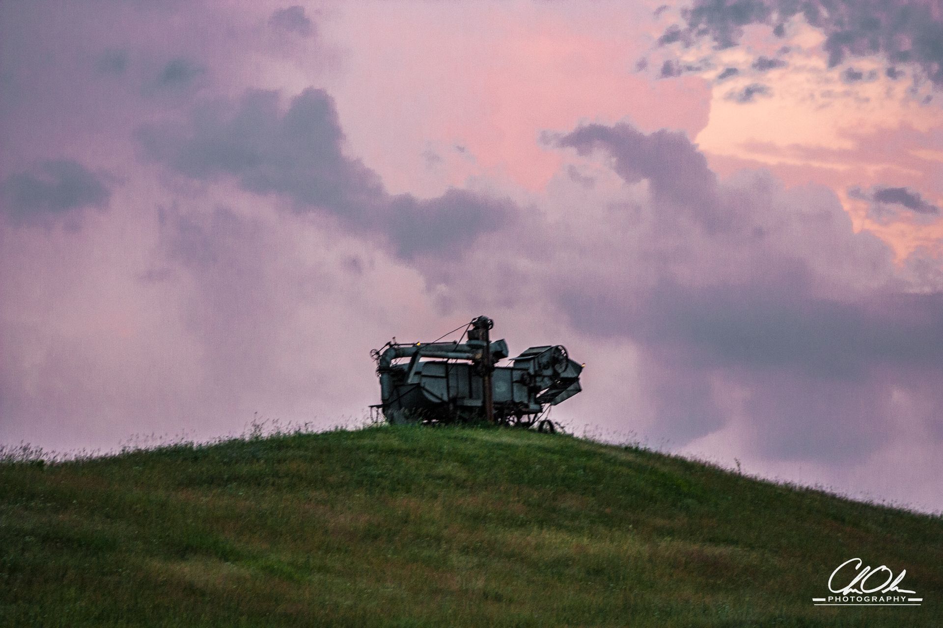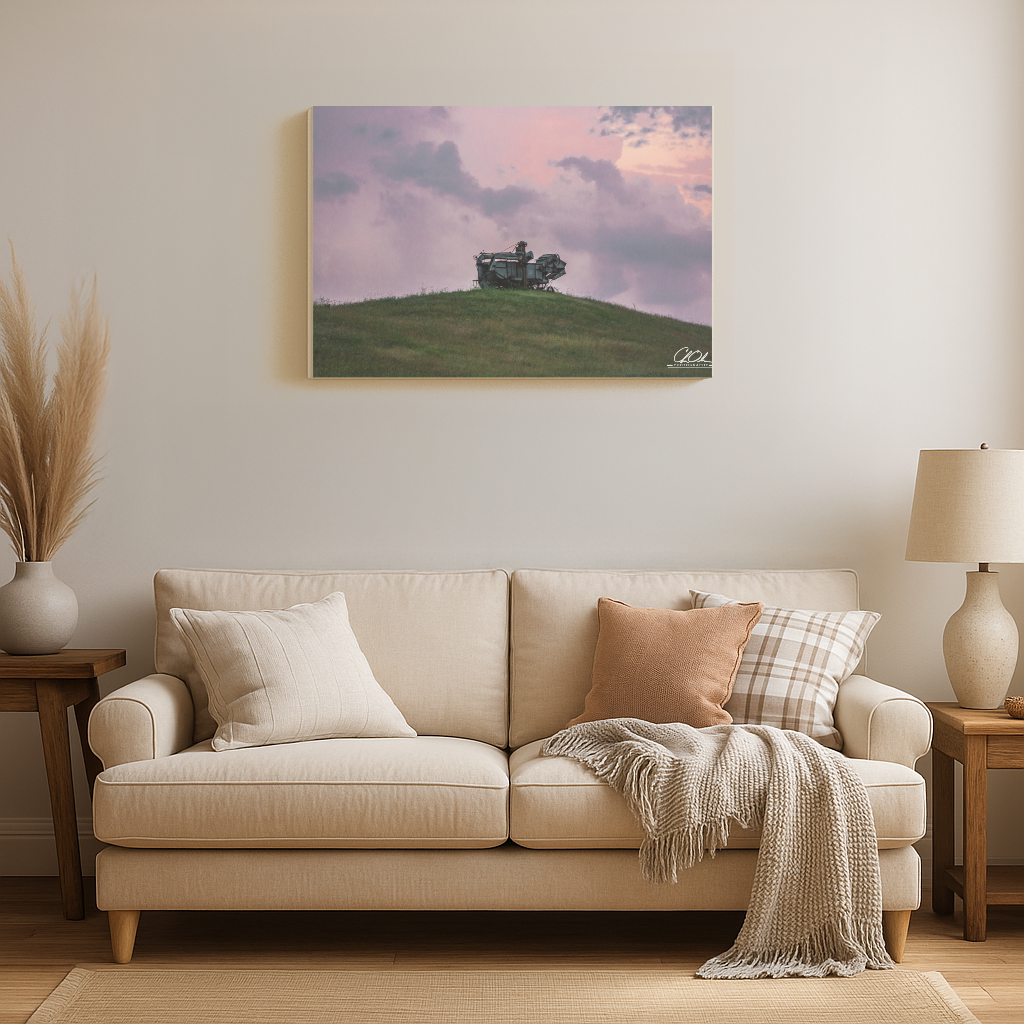 In this evocative scene, a forgotten relic stands sentinel against the horizon, its rusted surface illuminated by the fading light of day. The sky, a tapestry of purples and pinks, casts a serene glow, wrapping the landscape in a gentle embrace. The machine, a monument to bygone times, exudes a quiet dignity, as the wind whispers secrets through the grass. It is a portrait of solitude and nostalgia, capturing the silent stories of rural life left behind.