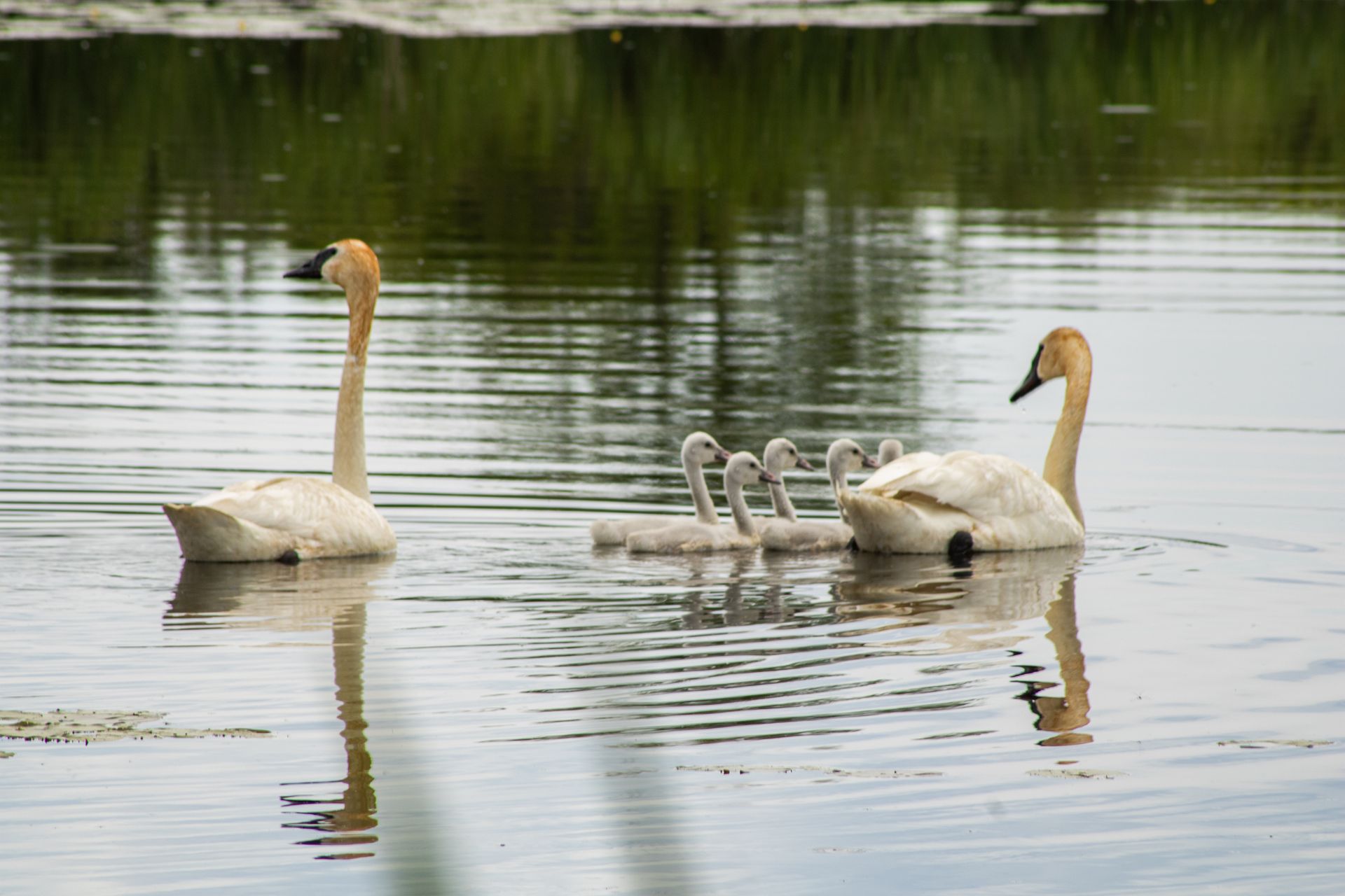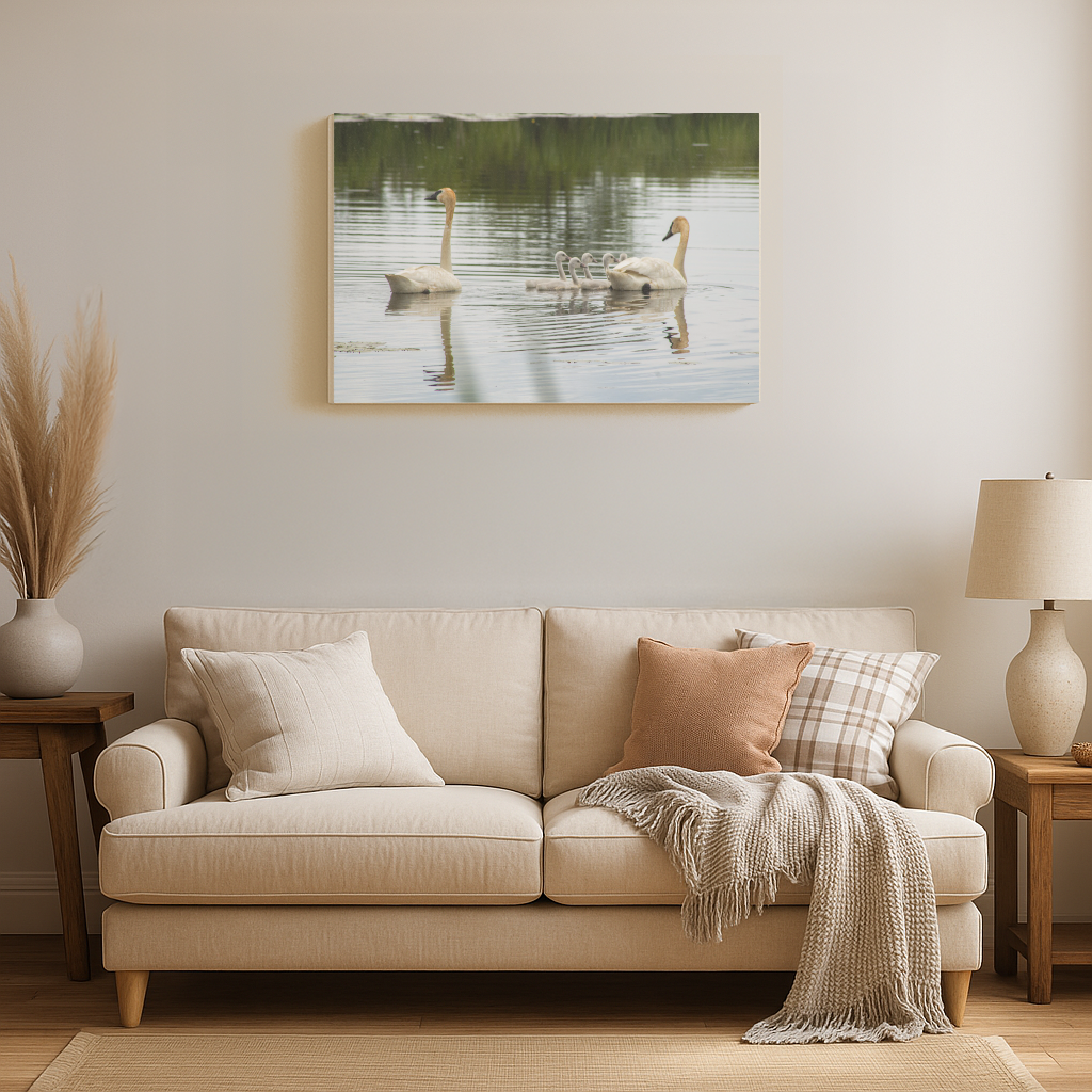 A pair of trumpeter swans glide silently across the water, leading five fuzzy cygnets in perfect formation. The gentle ripples and mirrored reflections frame a rare and tender moment of unity in the wildwhere instinct, grace, and devotion move as one. Amidst the gentle embrace of mirrored water, a swan family carves a serene narrative. The adults lead with elegant poise while the cygnets, delicate and new, follow in a soft procession. Light dances subtly across the water’s surface, casting reflections that capture fleeting moments of connection. Lush greens frame the distant background, accentuating the intimate foreground. The composition whispers of calm and continuity, offering a glimpse into nature’s tender choreography.