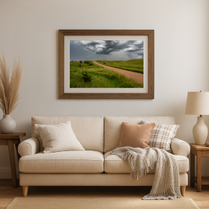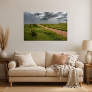 In this captivating landscape, a lone dirt road winds through lush, rolling hills, drawing the eye toward the horizon. Above, the sky forms a tumultuous tapestry of swirling storm clouds, hinting at a brewing tempest. The vibrant green of the grasses contrasts starkly with the darkening heavens, creating an intense mood of anticipation. The land seems to hold its breath in a moment suspended between calm and chaos. This photograph captures the raw, potent beauty of an approaching storm, offering a serene yet powerful visual feast.
