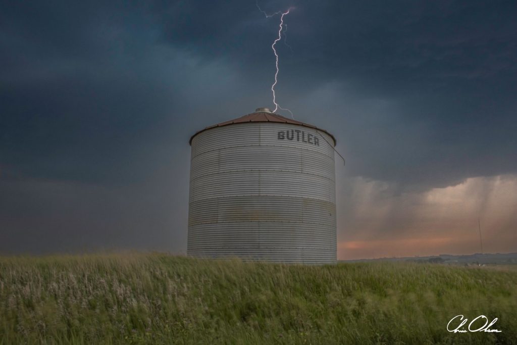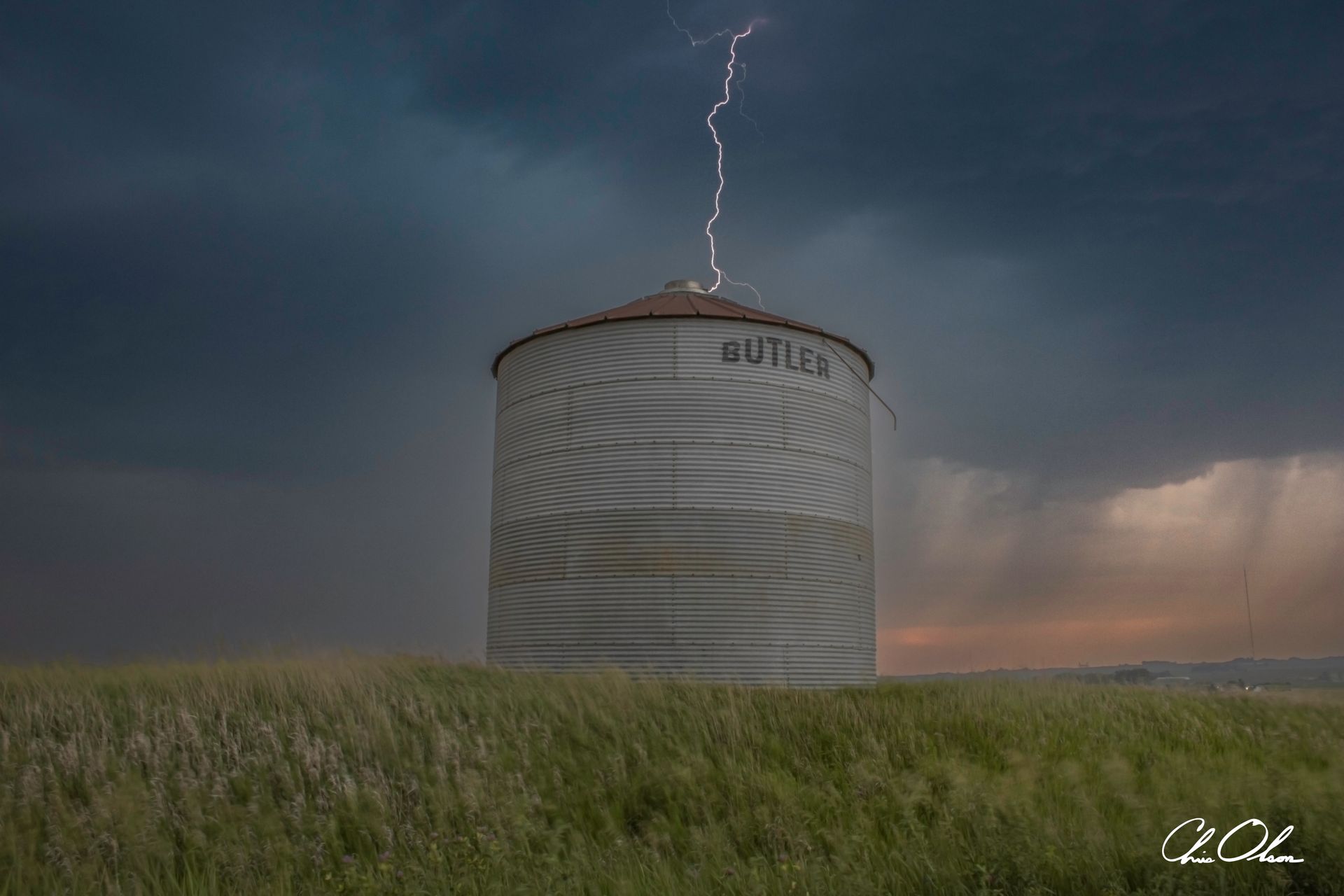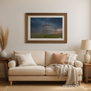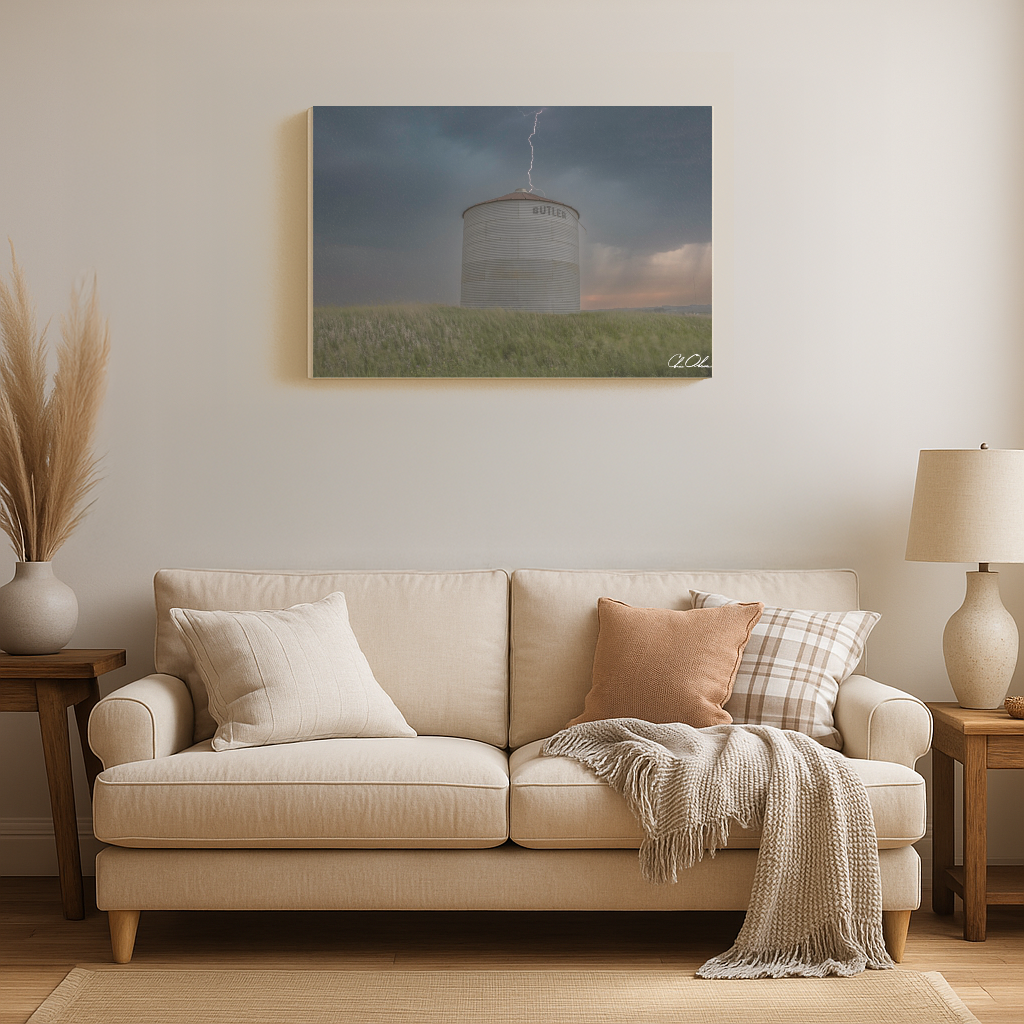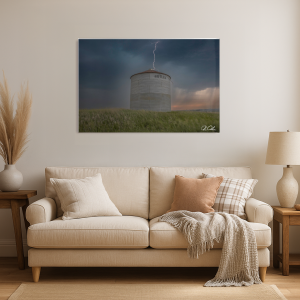 Amidst the sweeping plains, a solitary grain bin rises against the backdrop of a brooding storm. Lightning slashes through the sky, casting a brief but brilliant spotlight on its rugged structure. The scene is imbued with a tense serenity, as the heavens prepare to unleash their might. A moment captured in stillness, where land and sky collide in an electrifying dance. The muted palette of stormy grays and lush greens adds depth to this vivid spectacle, evoking both awe and introspection. Captured near the MNSDIA border, this moment came together in a single long exposure. The lightning didnt hit the grain binbut lit the sky behind it just right. No composites. Just timing, wind, and the raw voice of the prairie.