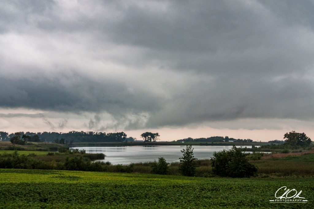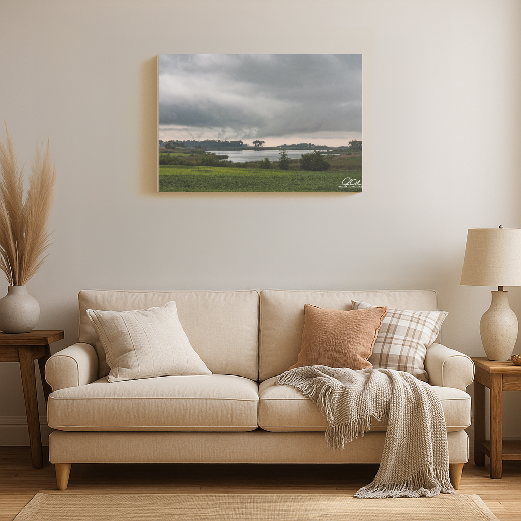 In this evocative scene, heavy clouds weave an intricate tapestry of gray across the sky, casting a mysteriously calm aura over the placid waters below. The fields, vibrant with life, lay in stark contrast to the impending storm, offering a quiet moment of reflection and tension. The lone trees dotting the horizon stand as sentinels, witnesses to the calm before the storm. This image draws the viewer into an intimate dance between tumult and tranquility, where nature’s power and beauty exist in a delicate balance.