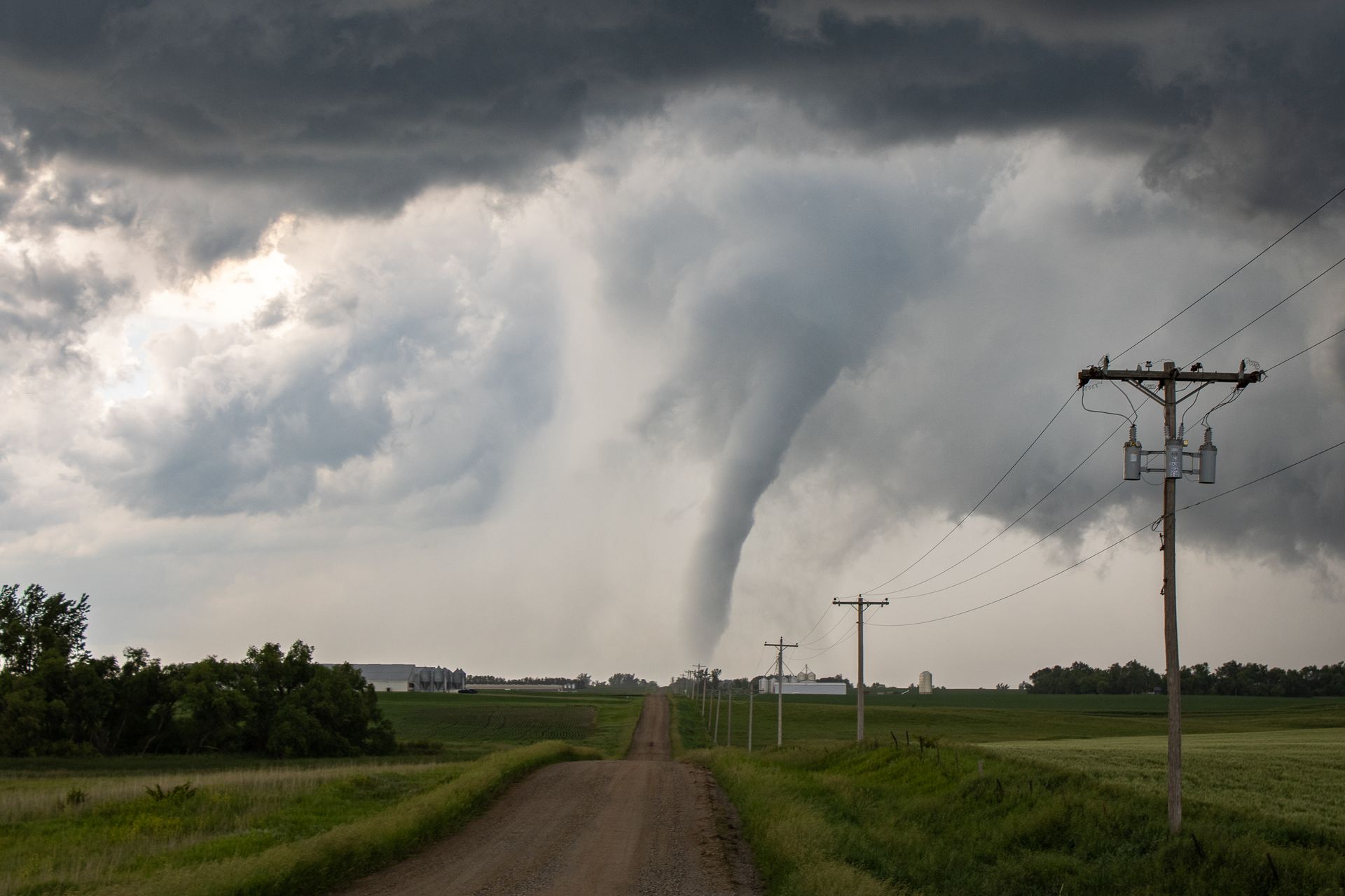 A tightly wound tornado stretches from storm to soil near Clear Lake, South Dakota, on June 28, 2025. Perfectly aligned with a rural gravel road and framed by utility poles, the funnel carves a path toward a farmstead in the distance. The soft daylight piercing through turbulent clouds adds a surreal calm to this otherwise violent scenean iconic image of tornado alley’s raw tension between beauty and destruction.