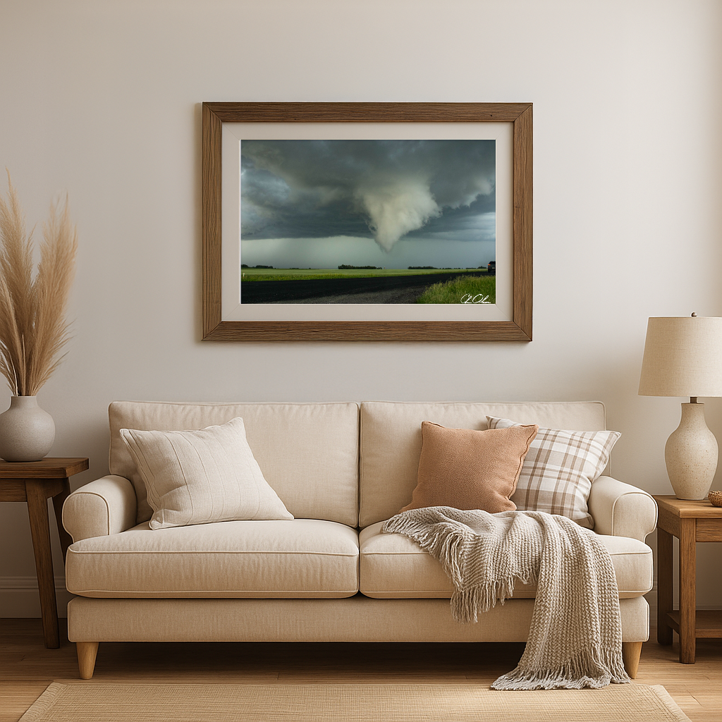 In this striking scene, an imposing funnel of wind coils with a menacing beauty, drawn down from the brooding tapestry of storm clouds. The earth appears still in anticipation, as if the very air quivers with the storm’s electric charge. The open expanse of green fields stretches out, contrasting with the dense and heavy sky. A lone vehicle on the dark road hints at fleeting human presence, dwarfed by natures raw spectacle. This image captures the delicate dance between land and sky, a moment of impending chaos rendered in breathtaking clarity.