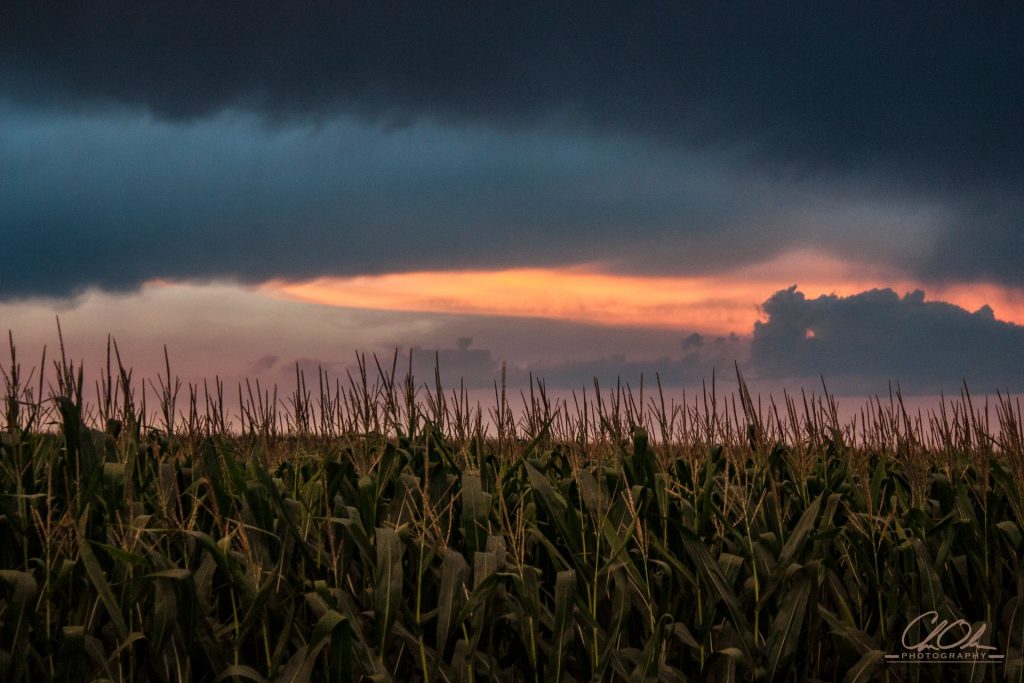 As twilight embraces the horizon, a vibrant orange glow pierces through storm-laden skies over the cornfields.