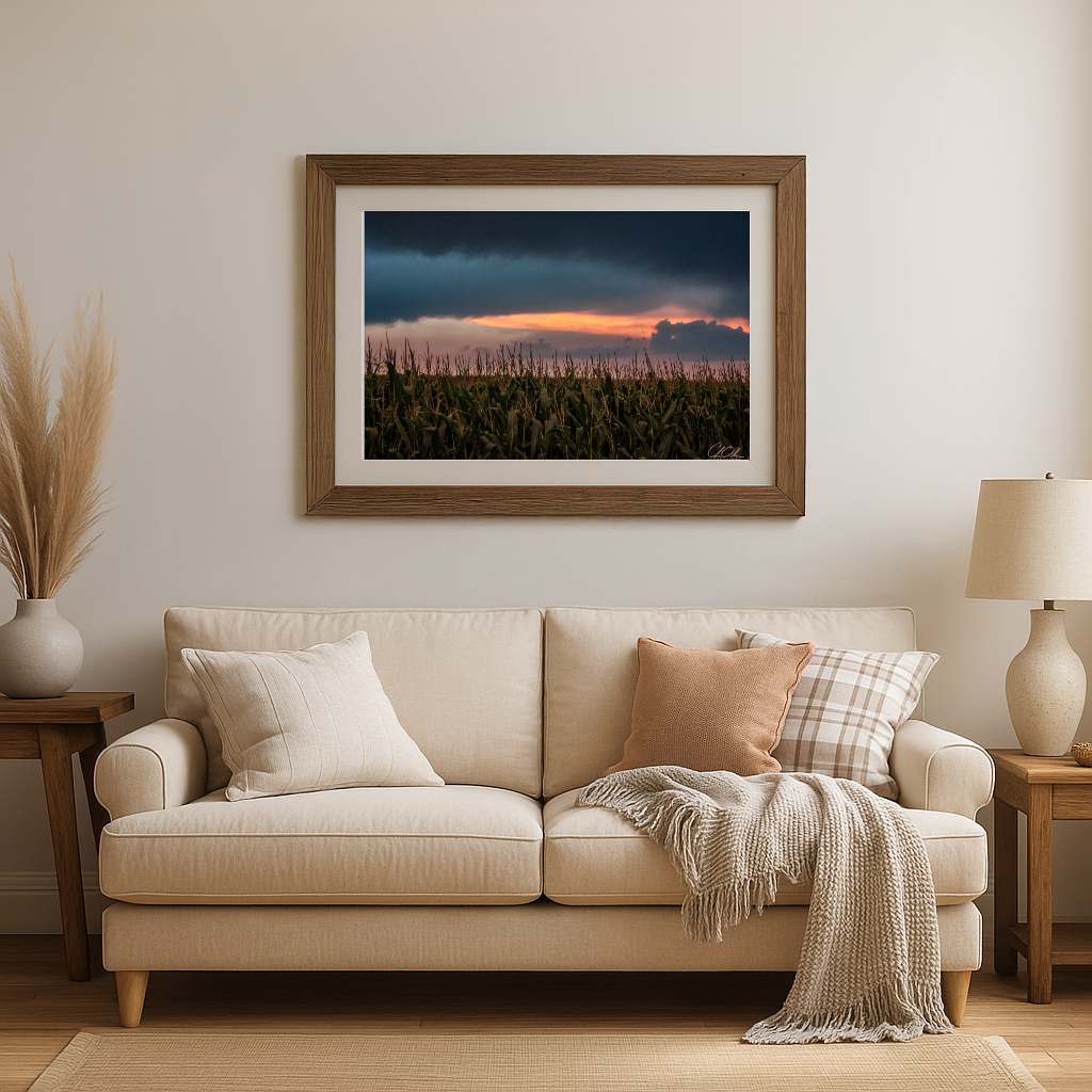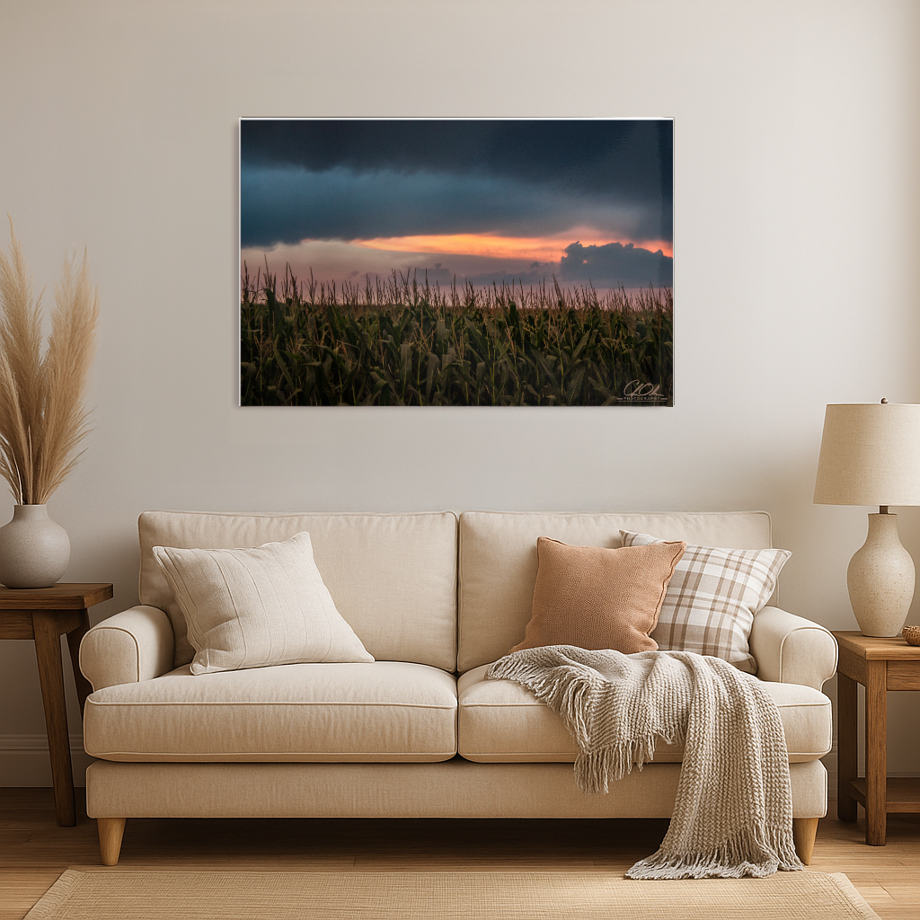 In the gentle surrender of day to night, the sky unfolds a dramatic spectacle. Dark, brooding clouds hover ominously over a vast cornfield, framing the scene with nature’s own shadowplay. Beneath this dark canopy, an unexpected ribbon of orange light cuts through, infusing the scene with a paradox of peace and power. It’s a moment of raw beauty and transition, captured as the day exhales into twilight. The fields stand silent, their steadfast presence a testament to quiet resilience against the backdrop of a restless sky.