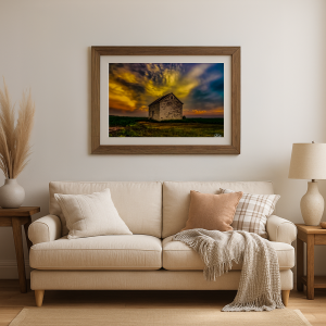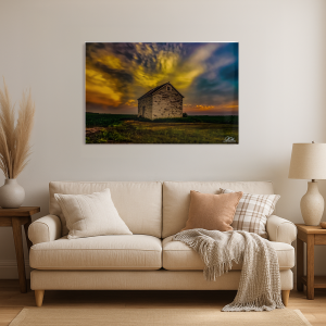 In the heart of the Midwest, a humble barn stands resilient against the sweeping canvas of twilight The sky is ignited with intense shades of gold, crimson, and indigo, swirling like an artists brushstrokes swept across the horizon This scene, captured at the edge of day, unfolds a story of solitude and time, echoing the whispers of wind over endless fields The barn, with its weathered wood and rustic charm, anchors the ephemeral beauty above, evoking a sense of peaceful nostalgia This photograph invites you to pause, to feel the gentle hush as the day surrenders to night