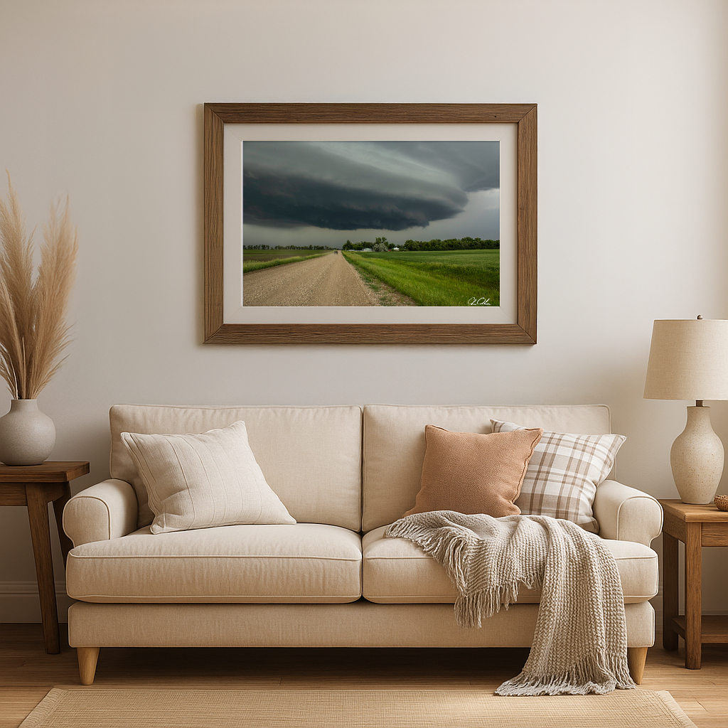 An ominous tornadic supercell looms over a rural North Dakota farmstead on June 20th. With its stacked, rotating structure and low wall cloud, this storm was moments from producing a confirmed tornado. The contrast between the peaceful green fields and the violent sky overhead captures the raw, unpredictable power of the Plains.Under a churning, inky firmament, a lone gravel path leads the viewer forward, drawing them into the storm’s embrace. The emerald fields flanking the road whisper of tranquility, stark against the oppressive clouds that darken the horizon.