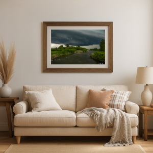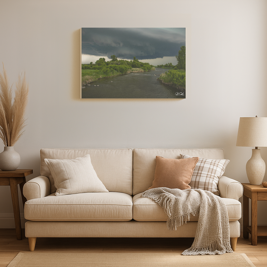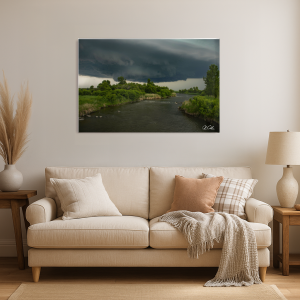 A turbulent sky commands the scene, heralding an unfolding drama above a tranquil, winding river.