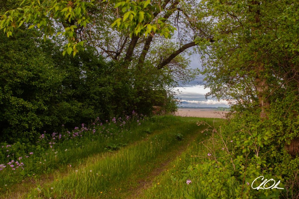 A serene path winds through lush greenery, revealing an open field kissed by distant clouds